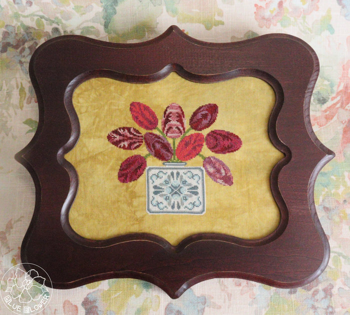The model is stitched on 40 count "Spicy Mustard" linen from Fiber On A Whim. Stitch count is 122 x 102. The model is finished with a scalloped opening picture frame (mahogany) from Signed and Numbered.