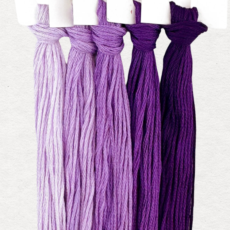 A gradient of hand dyed shades with tone on tone variegation, from pale to bold, sold exclusively together as a set. A perfect way to round out your thread stash or stock up on your favorite color families for substituting!