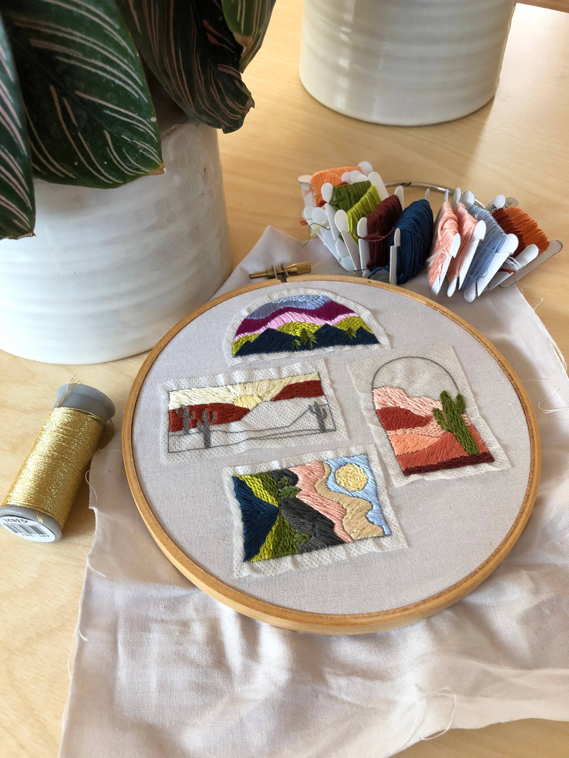 4 illustrated landscape peel, stick, and stitch designs- 2 desert and 2 pacific northwest inspired designs.