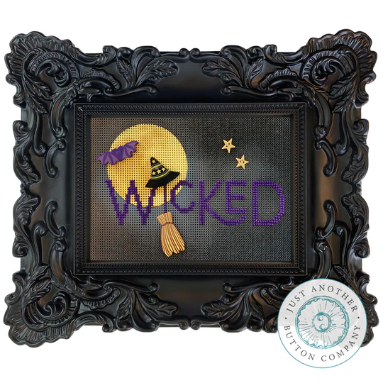 This "Wicked" perforated paper kit is a quick stitch with a unique twist. The spooky Halloween design features brand new broom and witch hat buttons--exclusive to this design!